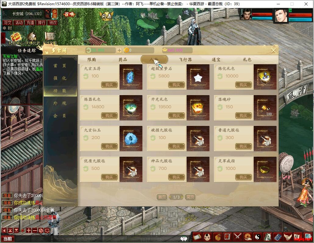 关于银子快速获取:打开GM工具连接(务改账号密码) 找到你的号 管理– 物品名称 数量 –然后游戏里面找到石破天 看看哪个物品回收高 就发送 然后回收即可!!!