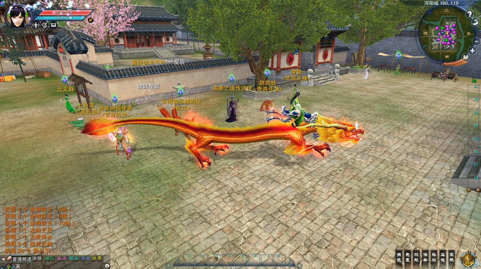 1.5 新增NPC梦静,出售游戏常用物品和开放兑换功能。新增NPC梦清,负责提供常规的每日任务。新增NPC长得像狐狸的狼,负责提供各类挑战任务。新增NPC跳跳蛙,负责提供各类奇遇任务。新增NPC新年祝福使者,提供新年活动任务。新增NPC七色莲,负责提供时装和药品兑换。